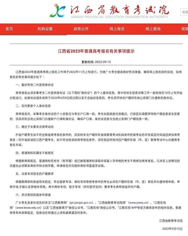 江西省教育考試院發(fā)布2023年高考報名重要提示! 11月上旬進行!