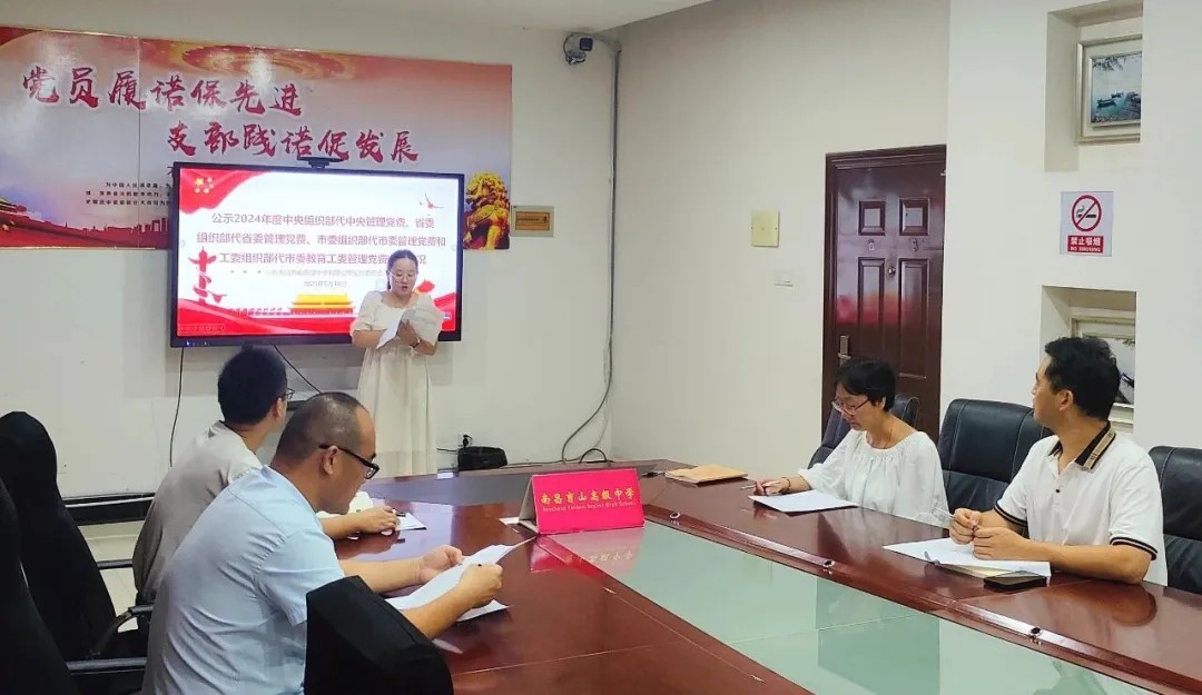 會(huì)上還開(kāi)展黨費(fèi)公示工作,通過(guò)傳閱《關(guān)于公示2024年度中央組織部代中央管理黨費(fèi)、省委組織部代省委管理黨費(fèi)、市委組織部代市委管理黨費(fèi)和工委組織部代市委教育工委管理黨費(fèi)收支情況的通知》,并宣讀《關(guān)于2024年度中共南昌育山高級(jí)中學(xué)有限公司支部委員會(huì)黨費(fèi)收支情況的公示》,確保黨費(fèi)管理公開(kāi)透明。