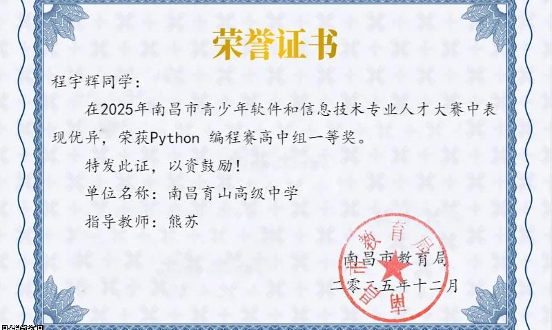 新年到,捷報(bào)至——育山學(xué)子榮獲Python編程競(jìng)賽雙獎(jiǎng) “開(kāi)年紅”!新年到,捷報(bào)至新的一年喜報(bào)至,2025年南昌市青少年軟件和信息技術(shù)專(zhuān)業(yè)人才大賽成績(jī)揭曉,我校學(xué)子在Python編程賽高中組中喜獲佳績(jī):程宇輝...