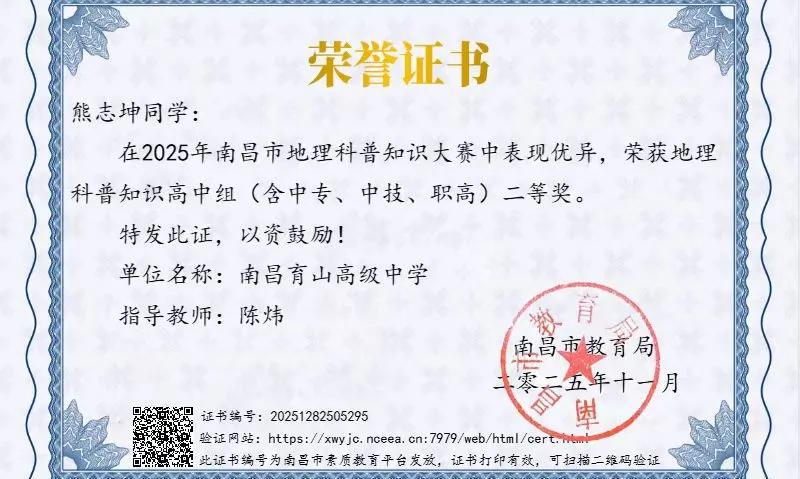 雙喜臨門(mén)——我校師生在市級(jí)賽事中雙雙斬獲佳績(jī)!近日,我校再傳捷報(bào):學(xué)校師生在2025年南昌市兩項(xiàng)市級(jí)賽事中表現(xiàn)亮眼,同步收獲榮譽(yù)!在南昌市地理科普知識(shí)大賽中,熊志坤同學(xué)憑借扎實(shí)的知...